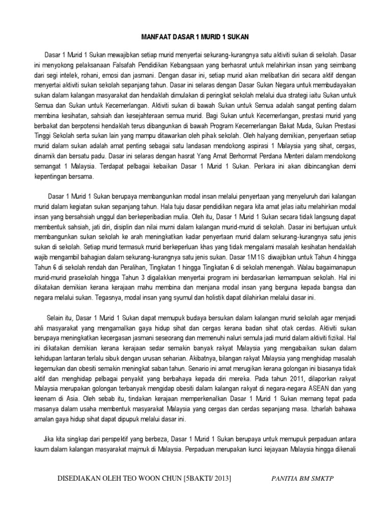 Tubuh yang sihat dan wang yang. Dasar 1Murid 1Sukan yang telah diperkenalkan oleh Menteri Pelajaran Malaysia pada tahun 2011 banyak mendatangkan manfaat kepada murid. Browse Study Resource Subjects.